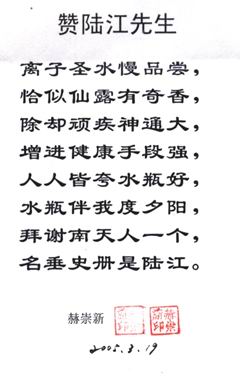 3. 詳細(xì)了解請(qǐng)上網(wǎng),可見(jiàn)臨床報(bào)告,鑒定證書(shū)、專(zhuān)家評(píng)說(shuō)、治病機(jī)理、用戶(hù)反饋、題詞、詩(shī)歌、錦旗等彩色掃描件,被譽(yù)為"神奇水瓶"。