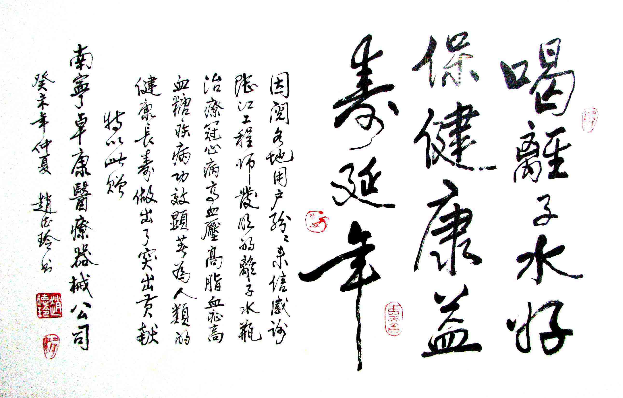- -- 幾千年來(lái),人類(lèi)靠醫(yī)藥不能根治冠心病、高血壓和糖尿病,如想根治,那是夢(mèng)想。可是,我從中國(guó)基礎(chǔ)醫(yī)學(xué)研究成果受到啟發(fā),研發(fā)了一種發(fā)明產(chǎn)品,處理出微小分子團(tuán)水讓人飲用,實(shí)現(xiàn)了人類(lèi)這一夢(mèng)想!患者飲用后遠(yuǎn)離了冠心病、高血壓和2型糖尿病。這一成果曾經(jīng)過(guò)臨床試用和專(zhuān)家鑒定,作為準(zhǔn)字號(hào)醫(yī)療器械讓廣大患者飲用,療效進(jìn)行跟蹤調(diào)查。很多患者的反饋情況令人感動(dòng),我放在公司網(wǎng)站上(nnzk.com),震撼了醫(yī)學(xué)專(zhuān)家,也使廣大同胞受到啟發(fā)。人們盼望飲用它給細(xì)胞補(bǔ)水,治愈多種病癥,既省錢(qián),又安全,而且延長(zhǎng)壽命。