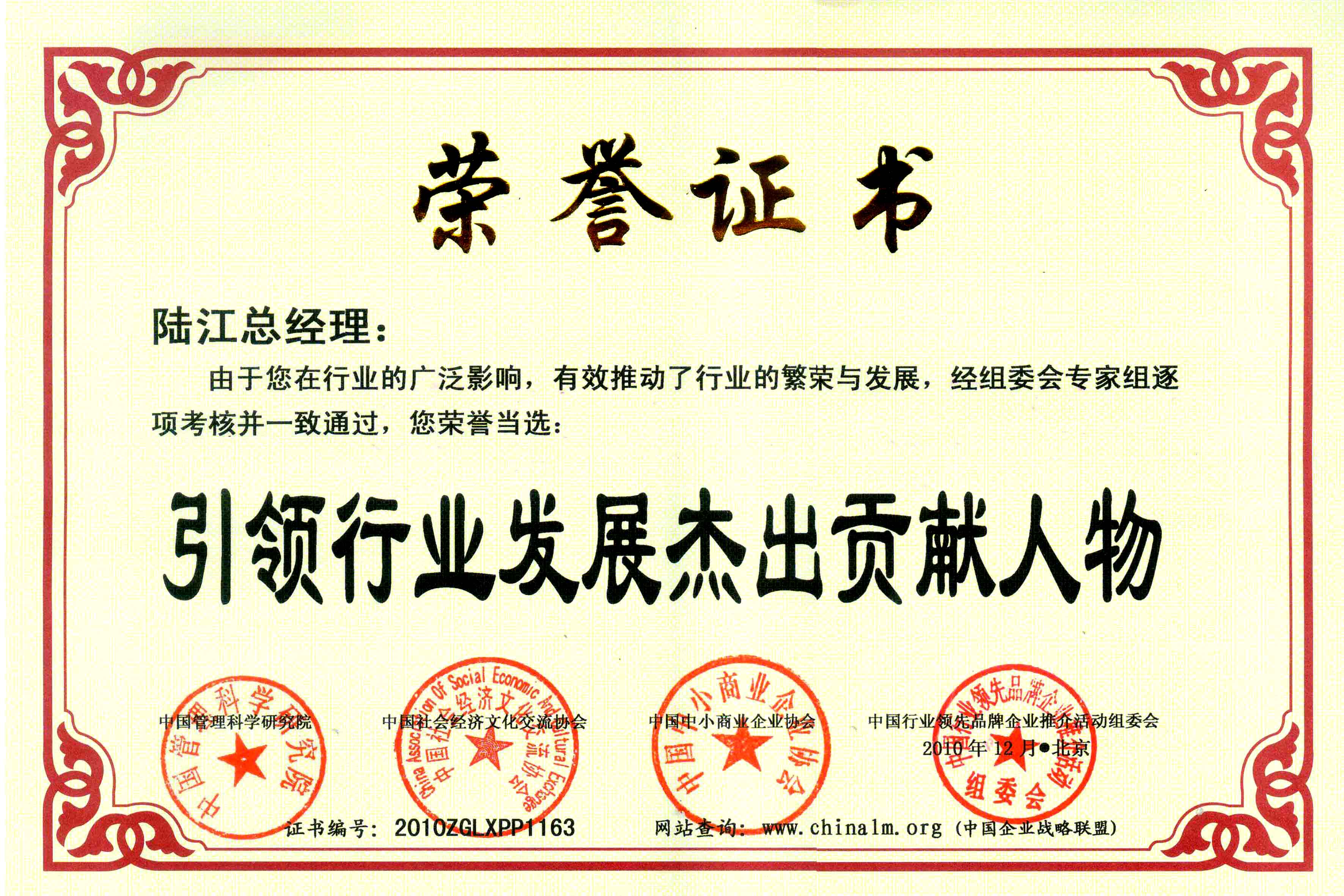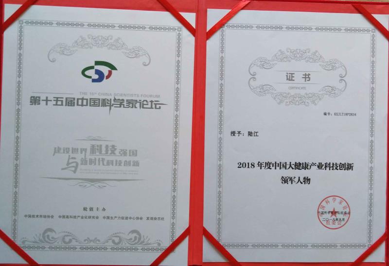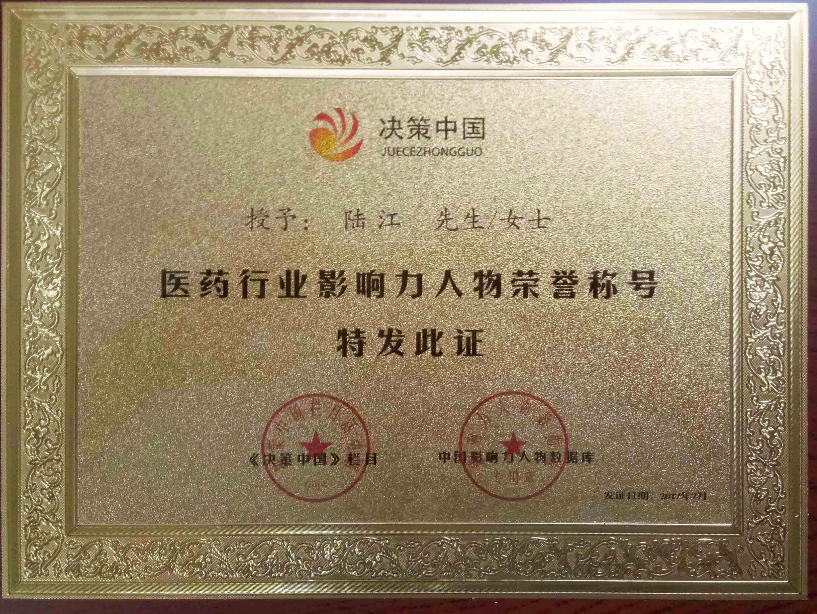 陸江榮獲醫(yī)藥行業(yè)影響人物證書(shū)