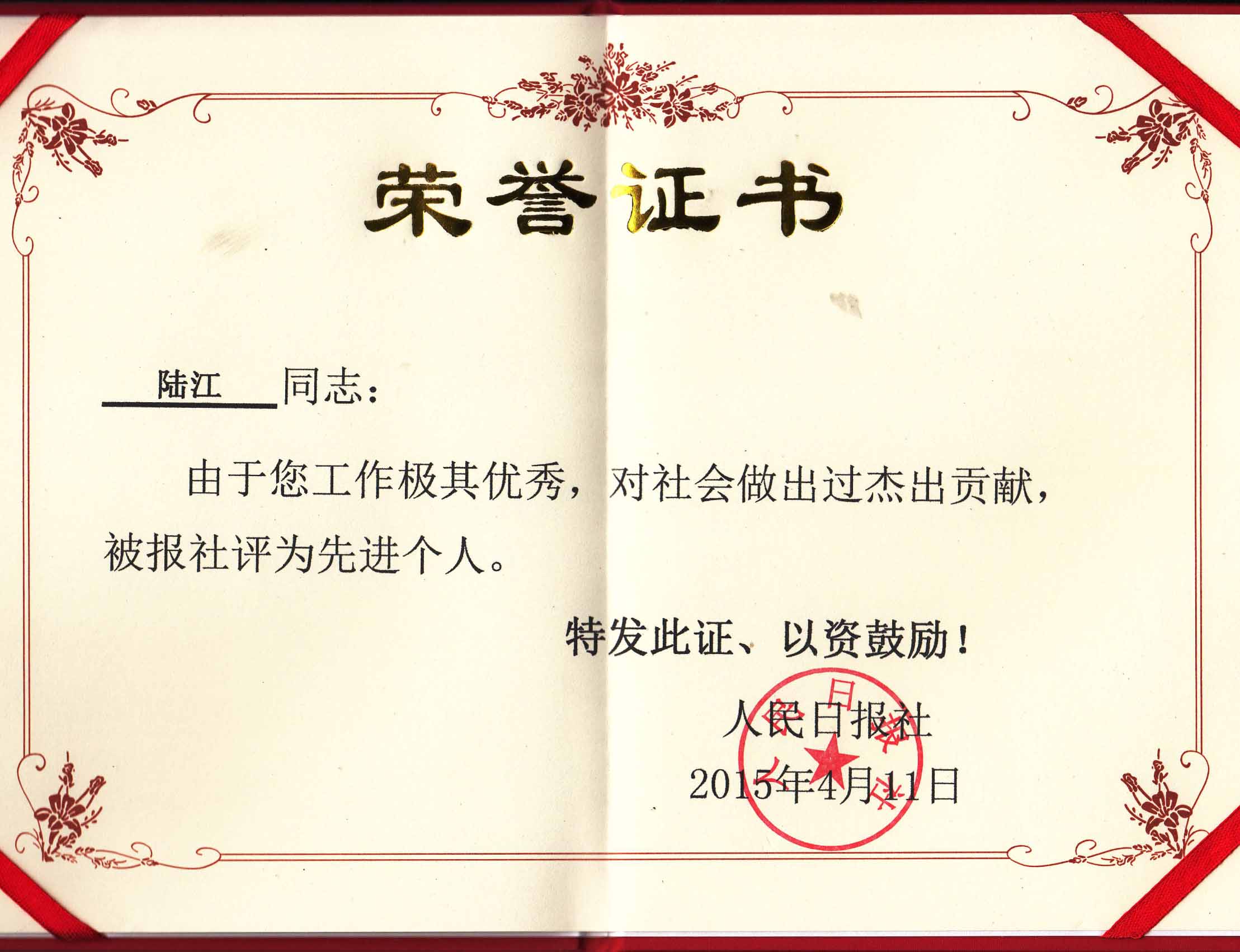 陸江的杰出貢獻(xiàn)被人民日?qǐng)?bào)社評(píng)為先進(jìn)個(gè)人