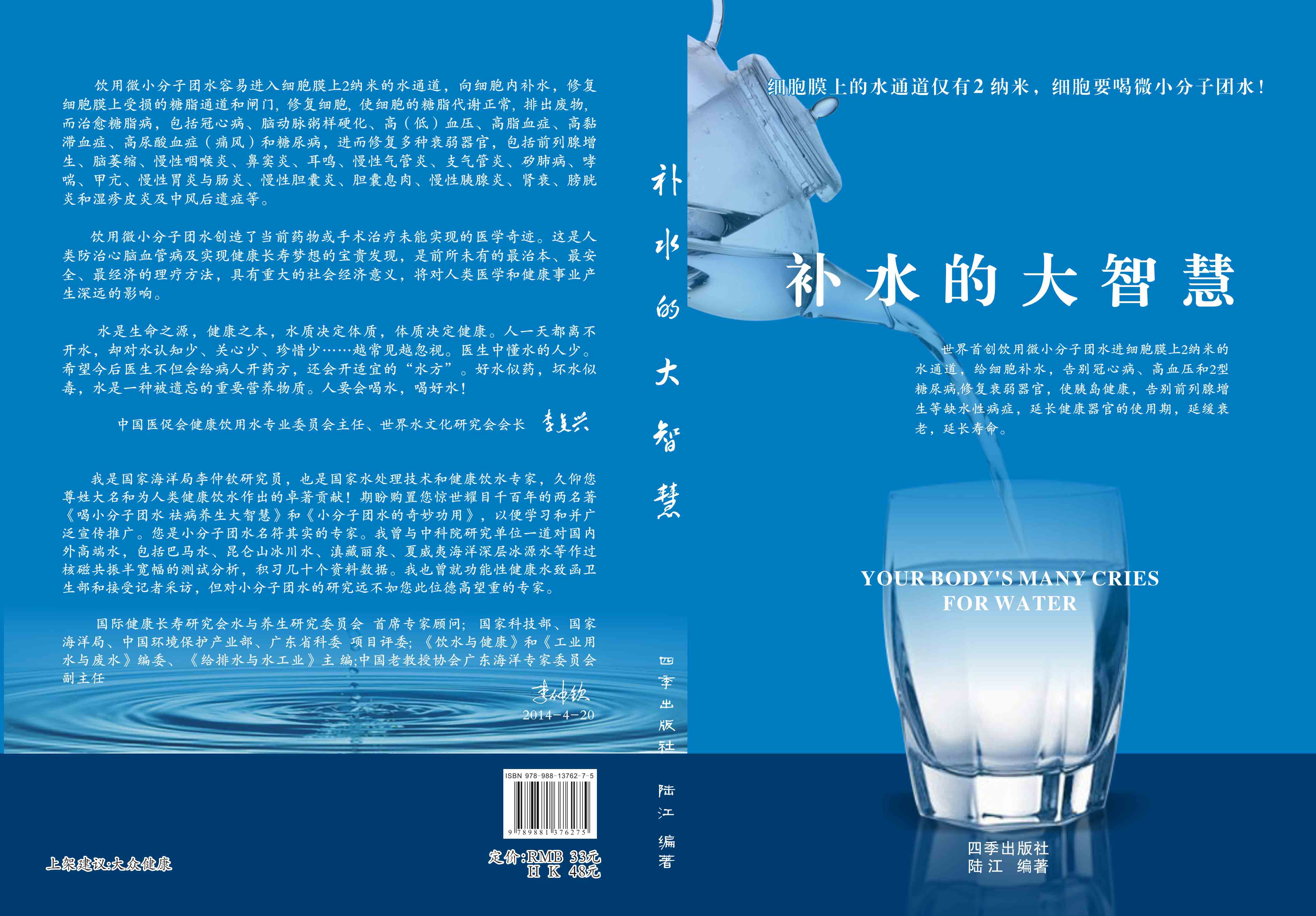 4. 陸 江新編著《延命水》一書(shū),全彩色印刷A4內(nèi)頁(yè)P(yáng)240 ;2014年由香港出版的《補(bǔ)水的大智慧》一書(shū),全彩色印刷16K內(nèi)頁(yè)P(yáng)218,郵購(gòu)贈(zèng)此書(shū),均送光盤(pán)。