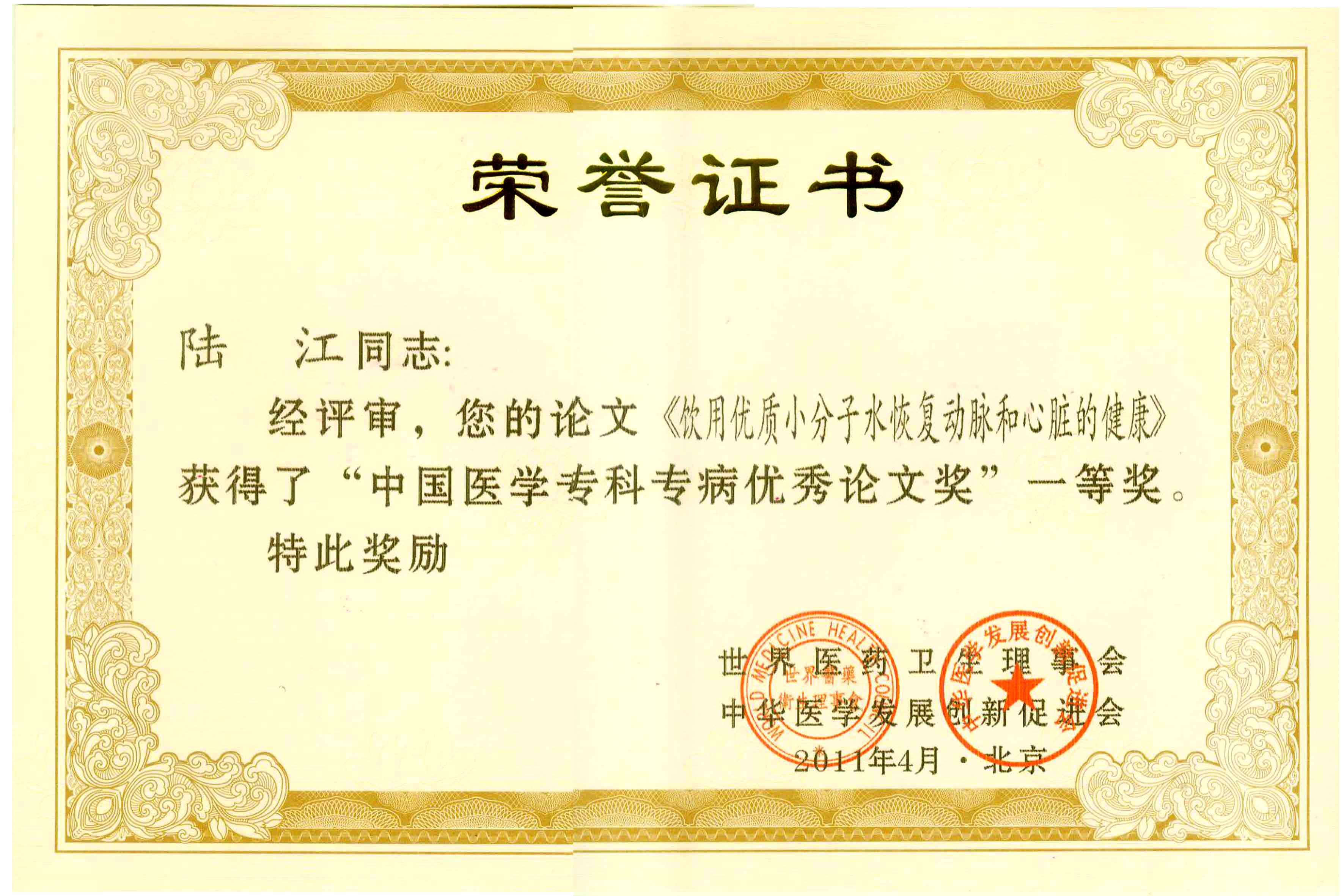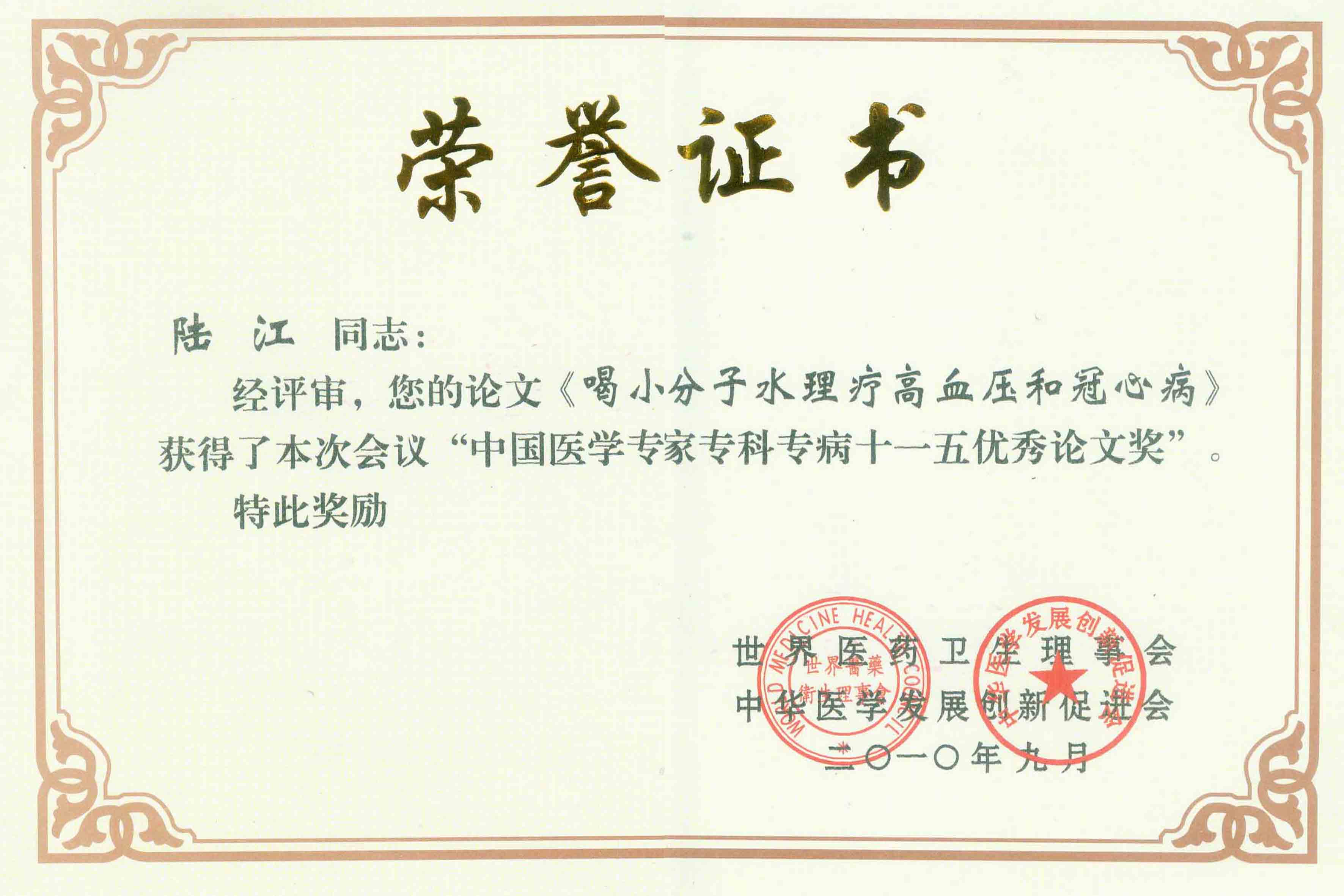 《飲用小分子水治療高血脂》獲優(yōu)秀論文獎(jiǎng)