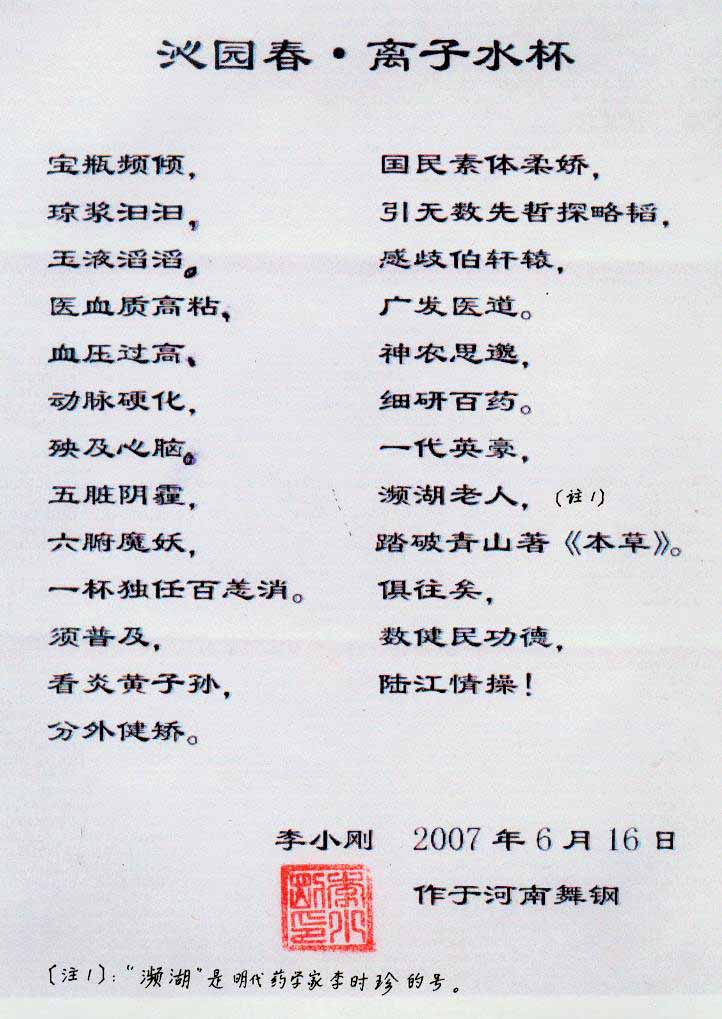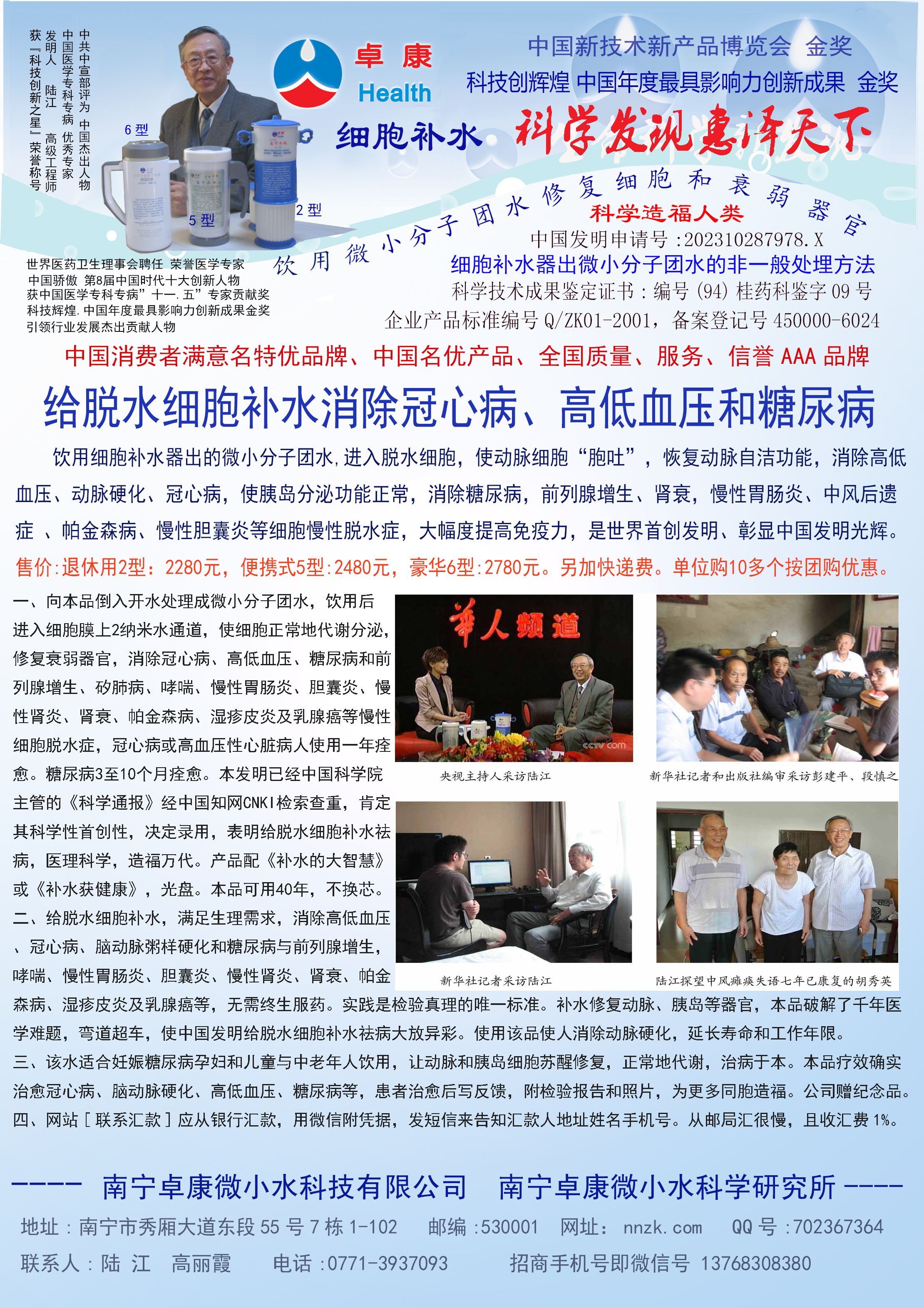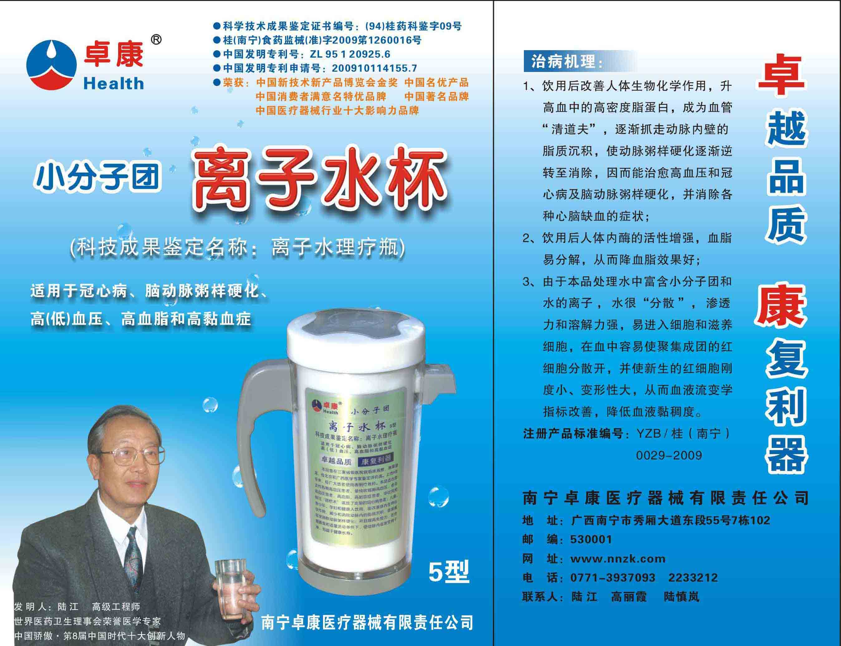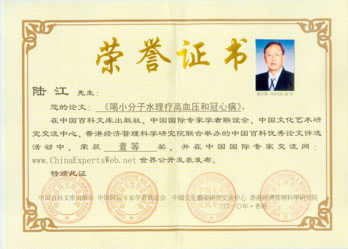 -----我是從事建筑的高工,本來(lái)沒(méi)有資格去攻克醫(yī)學(xué)難題,卻為了自身健康才扣響醫(yī)學(xué)的大門(mén)。由于我1990年患高血壓,因怕中風(fēng)才研究發(fā)明了離子水瓶,我把水處理成微小分子團(tuán)水,飲用后治愈了高血壓。便于1993年底送到三家省級(jí)醫(yī)院做臨床試用4個(gè)月。經(jīng)北京和廣西醫(yī)學(xué)專(zhuān)家鑒定:"降脂降壓效果好"," 能擴(kuò)大心腦動(dòng)脈流量,改善心腦電圖以及微循環(huán)","對(duì)治療心腦動(dòng)脈粥樣硬化、高血壓、高血脂有良好的醫(yī)療保健作用。""產(chǎn)品的技術(shù)性能和療效達(dá)到了同類(lèi)產(chǎn)品的國(guó)內(nèi)領(lǐng)先水平,經(jīng)廣西醫(yī)學(xué)科學(xué)情報(bào)研究所檢索,未見(jiàn)國(guó)外有類(lèi)似報(bào)道。"中國(guó)醫(yī)學(xué)科學(xué)院張正國(guó)教授從美國(guó)國(guó)立醫(yī)學(xué)圖書(shū)館數(shù)據(jù)庫(kù)存Medline檢索英俄文資料,均未見(jiàn)類(lèi)似報(bào)告。2000年上市后,我為了對(duì)消費(fèi)者負(fù)責(zé)而繼續(xù)觀(guān)察研究,一直通過(guò)《信譽(yù)卡》和《質(zhì)量跟蹤調(diào)查書(shū)》向患者承諾療效,請(qǐng)用戶(hù)使用6個(gè)月后反饋效果。和脂壓患者飲用2至5個(gè)月內(nèi),消除癥狀,停服藥物,血壓正常;冠心病患者飲用3~5個(gè)月逐漸減輕至消除心絞痛、房顫等癥狀,不再服藥,飲用1年左右心電圖正常,經(jīng)冠脈造影掃描無(wú)明顯狹窄,表明冠心病痊愈。大量患者還反映許多衰弱器官被修復(fù),讓前列腺增生、慢性咽喉炎、慢性氣管炎、支氣管炎、慢性胃炎、腸炎和膽囊炎等不藥而愈;2型糖尿病患者是因?yàn)橐葝u衰弱致病,飲用該水半年至一年,逐漸減藥至停藥,血糖尿糖正常,真正治愈2型糖尿病。中風(fēng)后遺癥患者飲用六七個(gè)月,可逐漸減輕至消除肢體和語(yǔ)言障礙,表明飲用該水能讓壽命很長(zhǎng)的神經(jīng)元細(xì)胞逐漸修復(fù),奇跡般地恢復(fù)肢體和語(yǔ)言功能。飲用后還使胸腺和脾臟兩個(gè)重要的免疫器官被修復(fù)和增強(qiáng),產(chǎn)生免疫細(xì)胞多,提高了免疫力,使人不生病或少生病。自此, 飲用微小分子團(tuán)水創(chuàng)造了攻克冠心病、高(低)血壓和糖尿病三大醫(yī)學(xué)難題的奇跡。人們對(duì)此感到不可思議,但實(shí)踐是檢驗(yàn)真理的唯一標(biāo)準(zhǔn)。