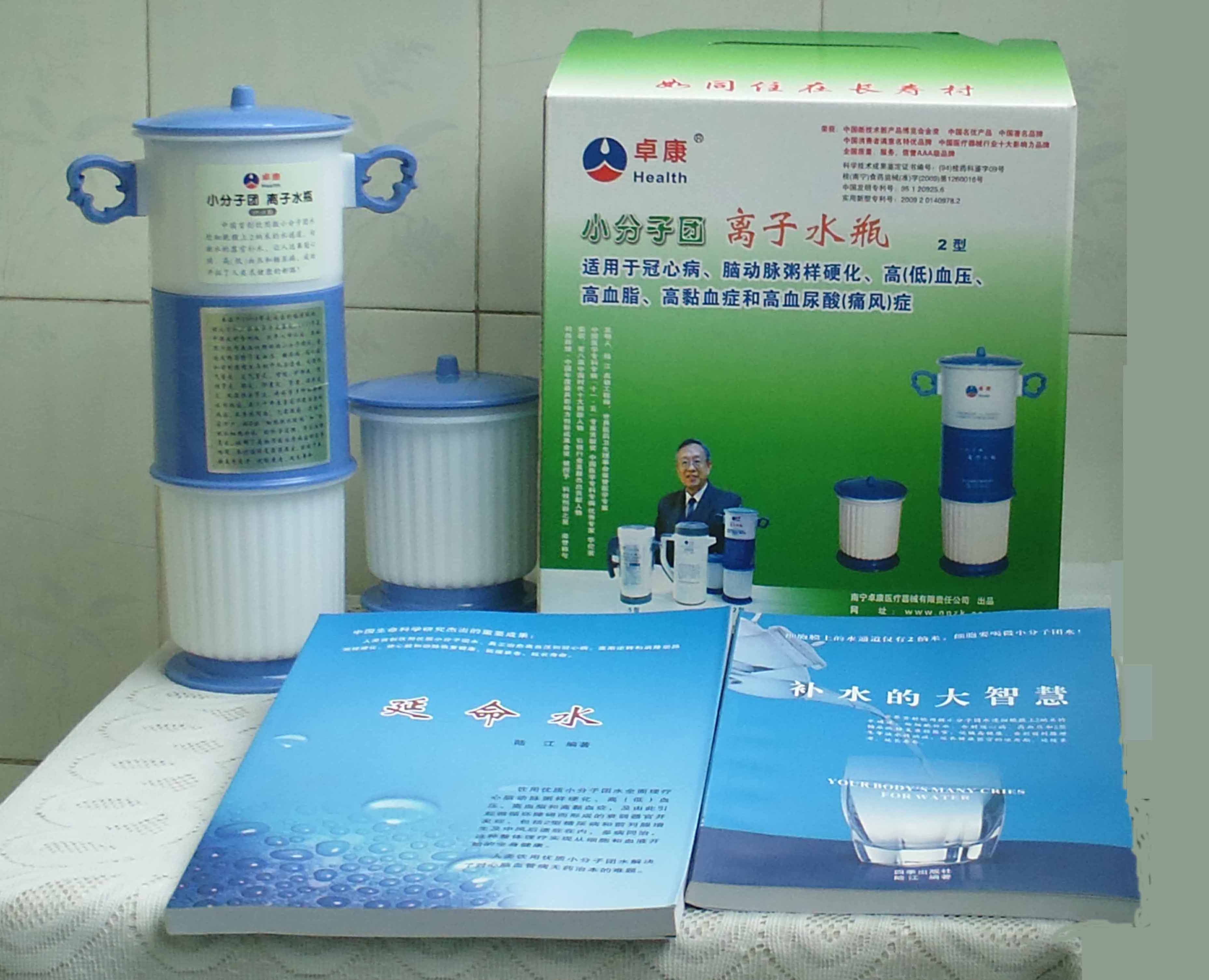 本品大量用戶(hù)的使用效果表明,能治愈冠心病、腦動(dòng)脈硬化、原發(fā)性高(低)血壓、高血脂、高粘血癥、高血尿酸癥(痛風(fēng))和2型糖尿病、衰弱器官并發(fā)癥(前列腺增生、腎衰與尿毒癥)及中風(fēng)后遺癥等療效好。產(chǎn)品配信譽(yù)卡。使用壽命30年,不換芯,易清洗。團(tuán)購(gòu)優(yōu)惠。從郵局匯款,匯費(fèi)1%,地址按本頁(yè)下方地址、聯(lián)系人寫(xiě)。從銀行匯款,請(qǐng)點(diǎn)擊[聯(lián)系匯款]欄,從工商銀行匯款,建設(shè)銀行、農(nóng)業(yè)銀行匯款,均免收匯費(fèi),匯款后20--30分鐘內(nèi)發(fā)短信,可用微信轉(zhuǎn)帳,均免匯費(fèi),微信號(hào)即手機(jī)號(hào)13768308380。匯款后,告知你的姓名和地址,我公司聯(lián)系人手機(jī)號(hào)是:13768308380卓康牌離子水瓶為我公司獨(dú)家生產(chǎn),郵購(gòu)產(chǎn)品配《補(bǔ)水的大智慧》彩印書(shū)一本,另配四季出版社出版的新書(shū)《補(bǔ)水的大智慧》一本,并配光盤(pán)一張(含央視主持人釆訪(fǎng)陸江的對(duì)話(huà)視頻)。目前市場(chǎng)和"淘寶網(wǎng)"上有人兜售假冒的偽品,望讀者審察辯別真?zhèn)危旒僬哓飧`假冒本公司的各種認(rèn)證、獲獎(jiǎng)獎(jiǎng)項(xiàng)、專(zhuān)利號(hào)和外包裝盒上的中英文字,包括科技成果的鑒定意見(jiàn)等,請(qǐng)讀者注意防偽。如何識(shí)別假貨?已經(jīng)買(mǎi)了假貨怎么辦?(請(qǐng)點(diǎn)擊[打假掠影][打假掠影])。