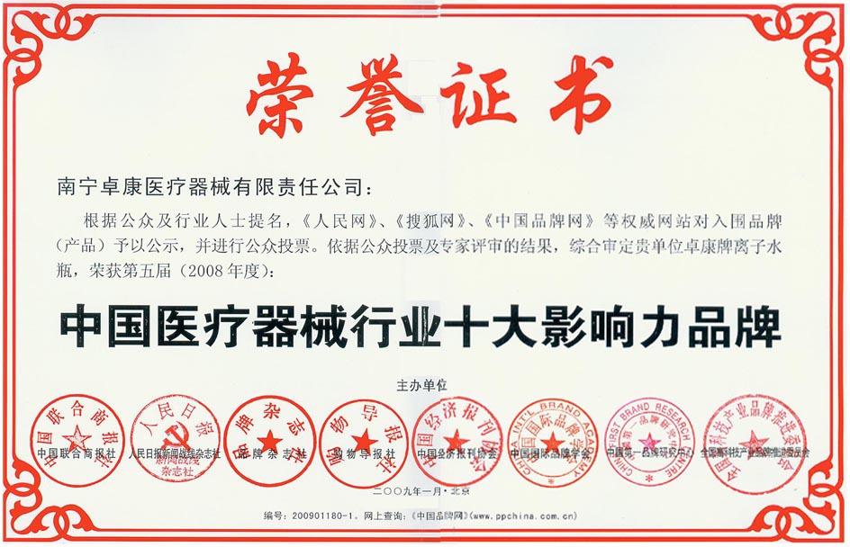 卓康牌離子水瓶榮獲中國(guó)名特優(yōu)品牌[點(diǎn)小圖見(jiàn)大圖] *榮獲中國(guó)醫(yī)療器械行業(yè)十大影響力品牌[點(diǎn)小圖見(jiàn)大圖]--------
