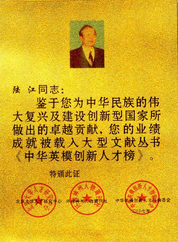 陸江的論文獲一等獎(jiǎng)榮譽(yù)證書(shū)-- 陸江論文獲創(chuàng)新論文獎(jiǎng)牌